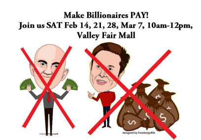 We’re expanding Tesla Take Down to Take Down Billionaires, and bringing the message to shoppers at Valley Fair Mall, that oligarchs are draining the country & the planet dry.