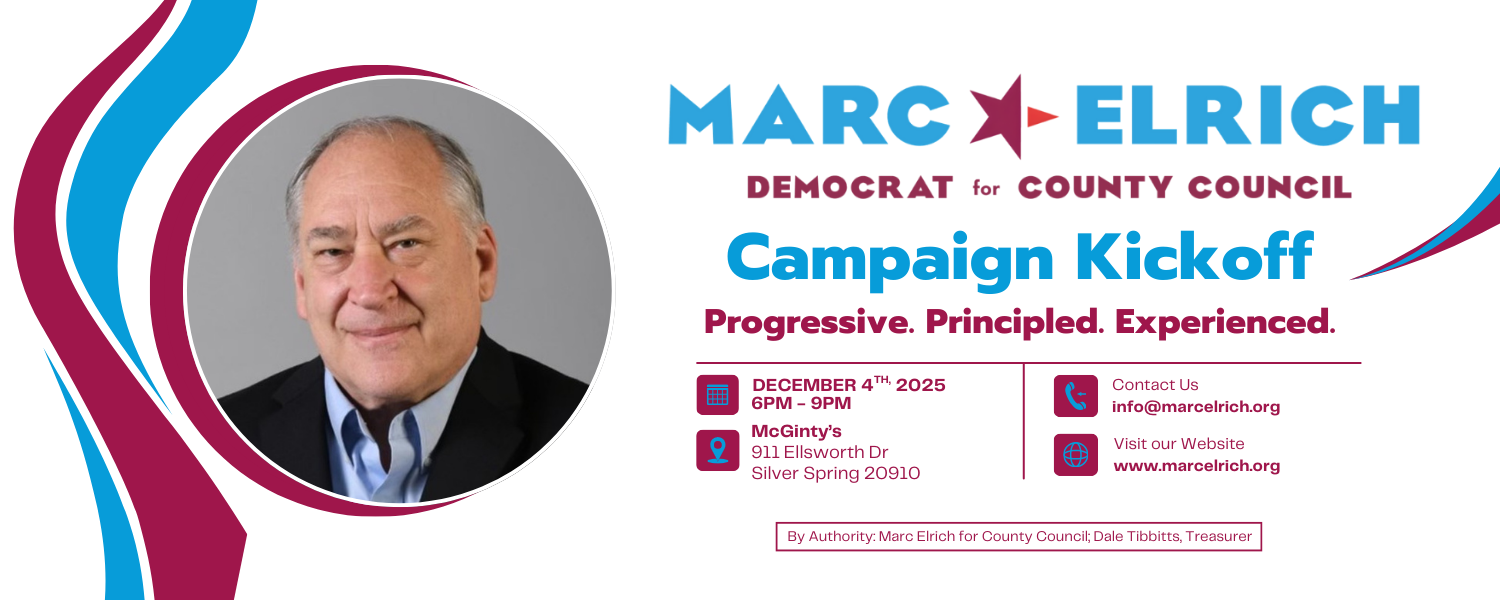 Marc Elrich invites you to join him to socialize and organize for his 2026 County Council campaign. Don't miss our our kickoff and enjoy great company, food, and spirits.