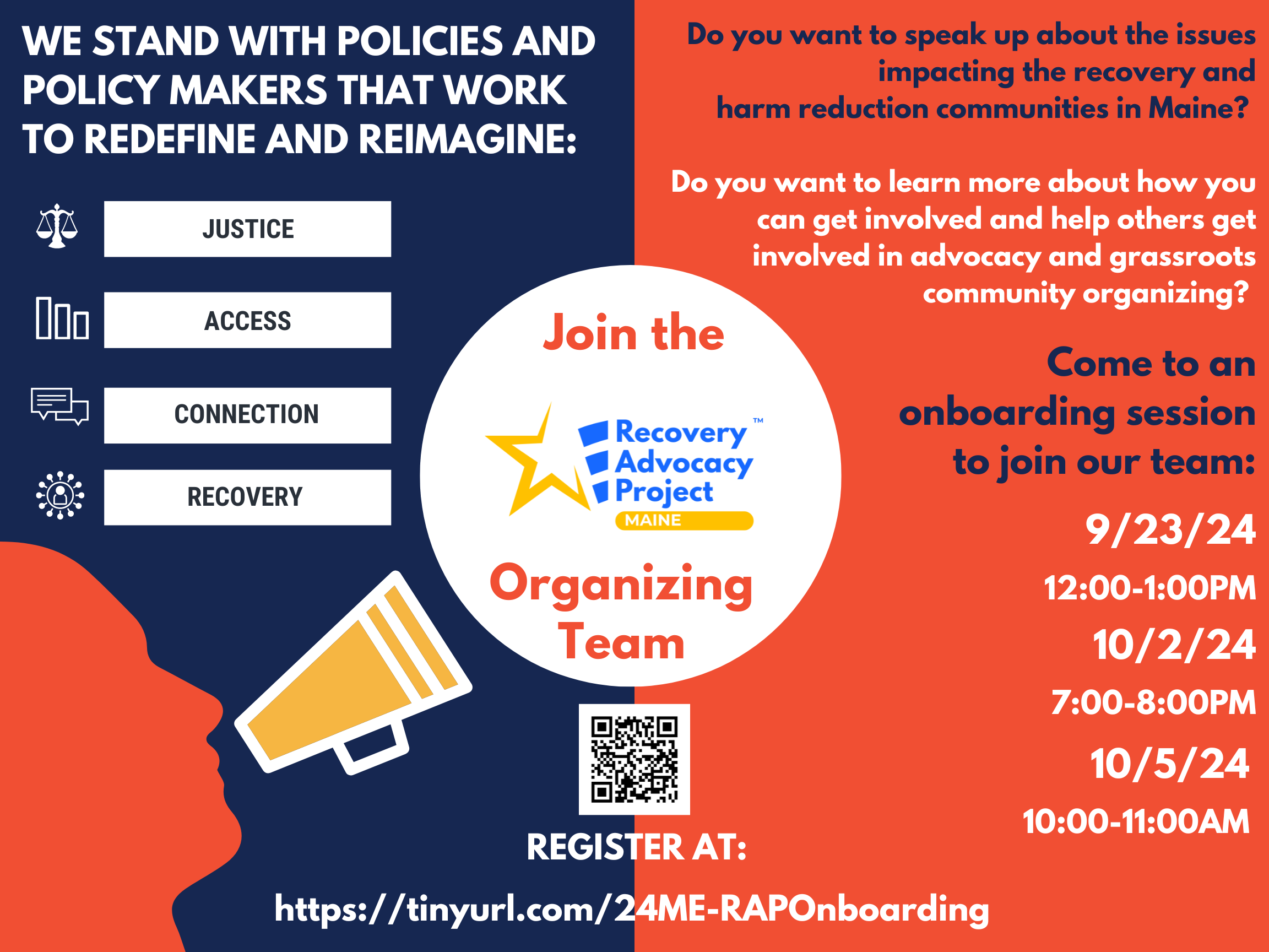 Join us for an onboarding session to the Maine Recovery Advocacy Project Organizing Team! These sessions will include a review of the work that we do as a team, your responsibilities as a volunteer organizer, and next steps. Attendance at one onboarding session is required to join the team. Register for an upcoming session today!