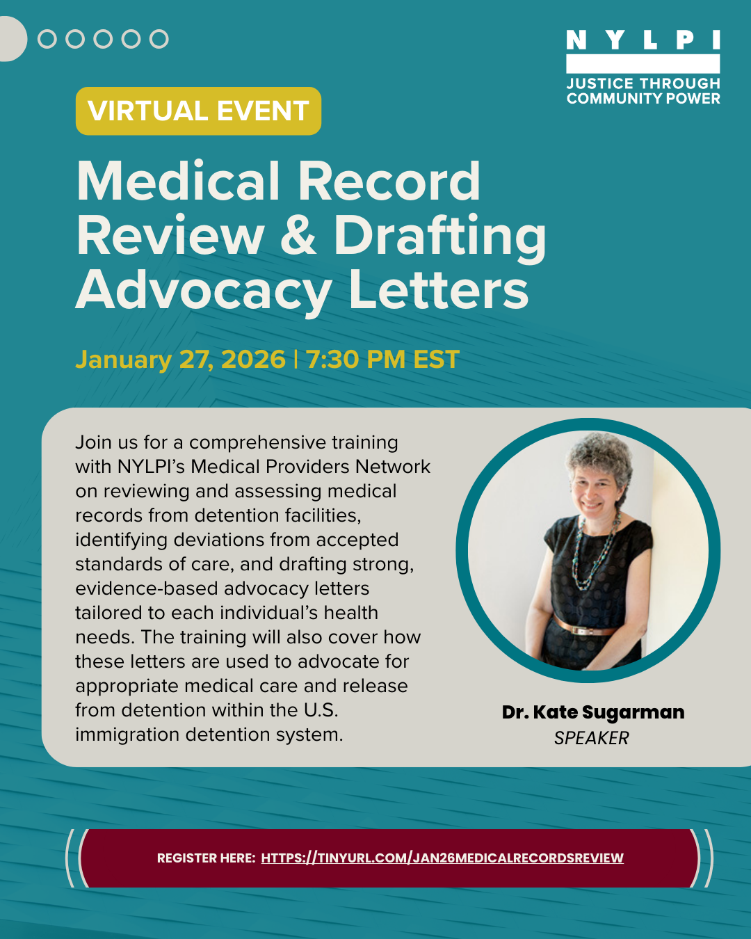 Join us for a comprehensive training with NYLPI’s Medical Providers Network on reviewing and assessing medical records from detention facilities, identifying deviations from accepted standards of care, and drafting strong, evidence-based advocacy letters tailored to each individual’s health needs. The training will also cover how these letters are used to advocate for appropriate medical care and release from detention within the U.S. immigration detention system.