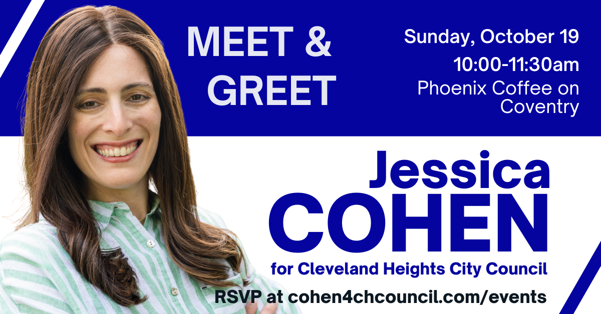 Kick off your Sunday with good coffee and great conversation. Meet Jessica Cohen, share what matters most to you, and talk about the future of Cleveland Heights.