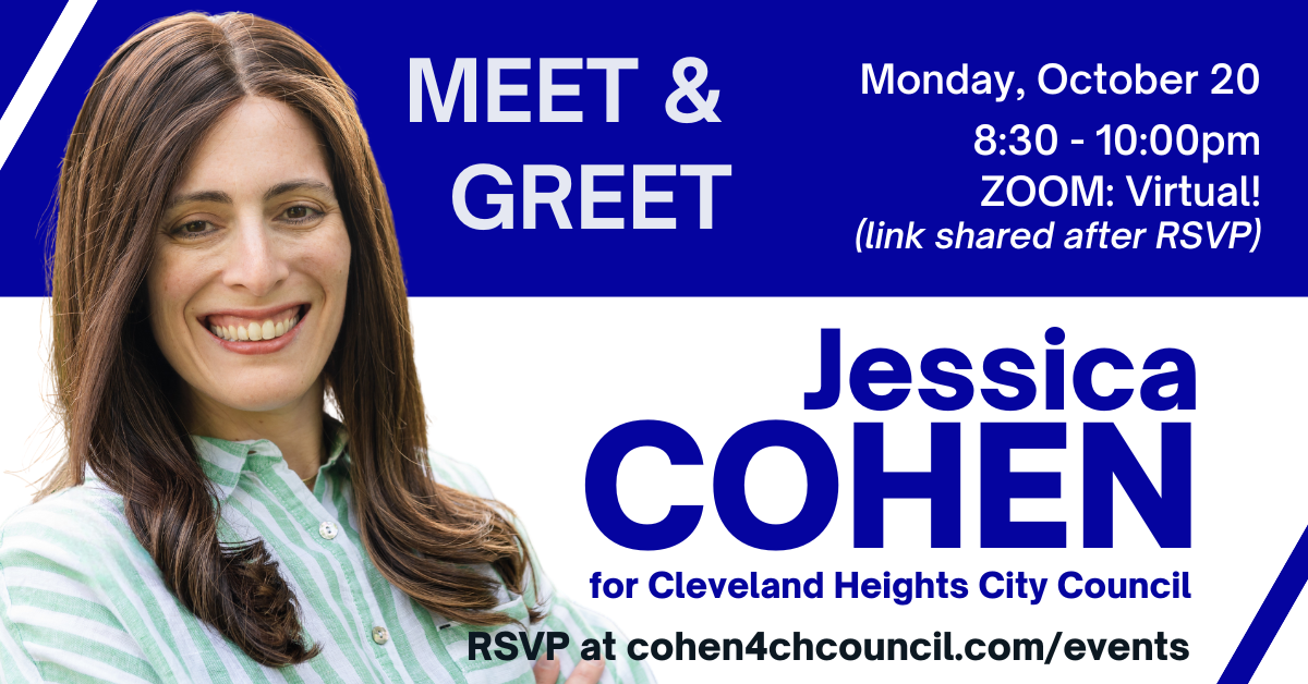 Can’t make it in person? Join Jessica online for an evening conversation from home! Ask questions, share ideas, and hear about Jessica’s priorities for Cleveland Heights.