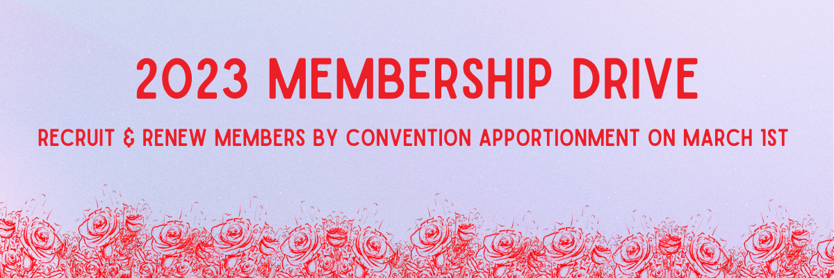 Every two years, elected delegates from every chapter in DSA set our national priorities and direction at the convention. The size of your chapter determines how many voting delegates your chapter can send in a process called apportionment in March. The Growth & Development Committee is running a Membership Drive in February to support chapters to boost their membership before the apportionment deadline on March 1st - a great way for your chapter to maximize your voice at our 2023 convention.