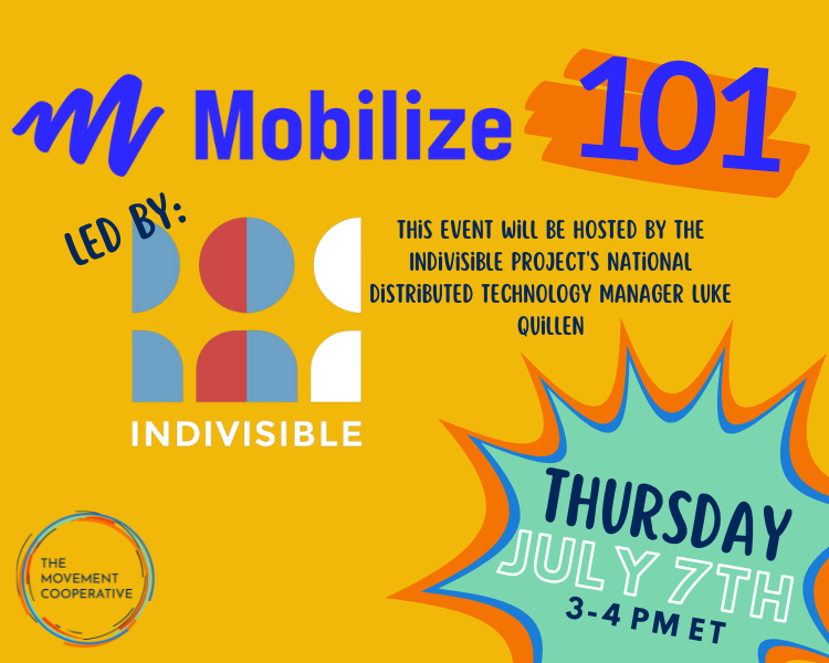 Join us for our Mobilize training event on July 7th at 3pm Eastern. This event will be hosted by The Indivisible Project's National Distributed Technology Manager Luke Quillen. Luke has worked at the intersection of tech and politics throughout his career, and currently leads Indivisible's work on Mobilize, both for the National organization and its local affiliates.