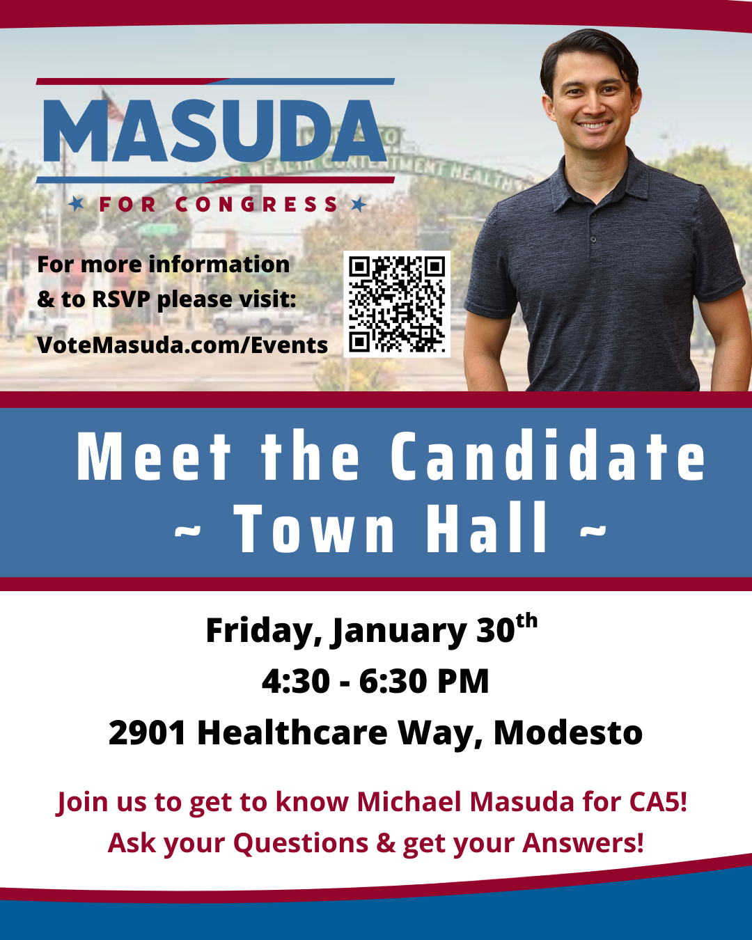 Masuda for Congress Meet the Candidate Town Hall in Modesto at the Residence Inn 2901 Healthcare Way, Modesto 95356 at 4:30 - 6:30 PM on January 30th