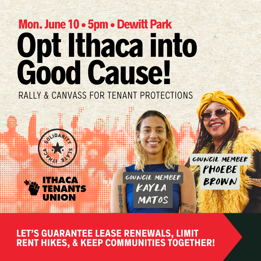 To pass a strong version that protects as many tenants as possible, we need a people-powered campaign that reaches as many Ithaca tenants as possible. We've spent hundreds of volunteer hours building supporter lists across the city — sign up here to join ITU and the Ithaca Solidarity Slate for a canvass!
