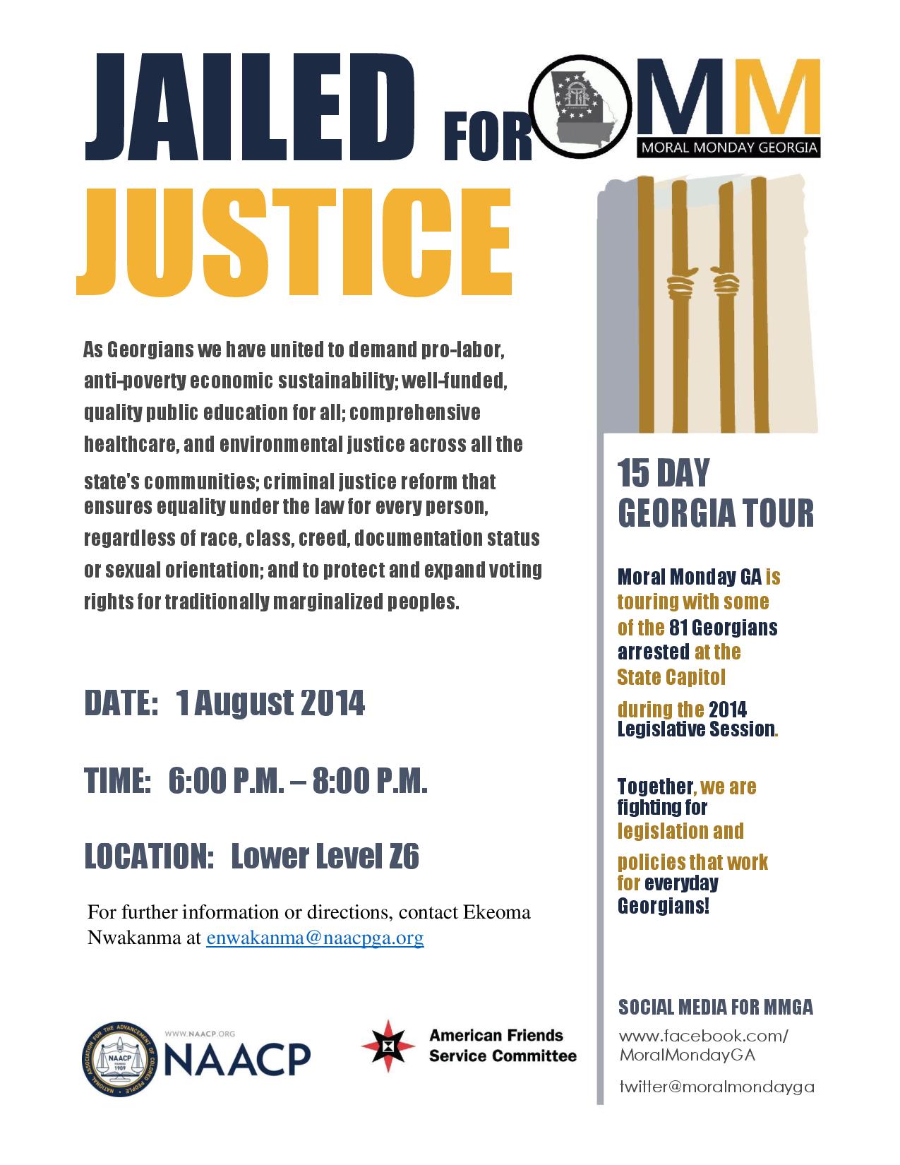 The, "Jailed for Justice" tour will feature a diverse group of 3-5 Moral Monday arrestees who will talk about why they choose to put their freedom on the line for their beliefs and what their hopes and dreams for the movement are as we count down to November's election and look forward to the 2015 legislative session