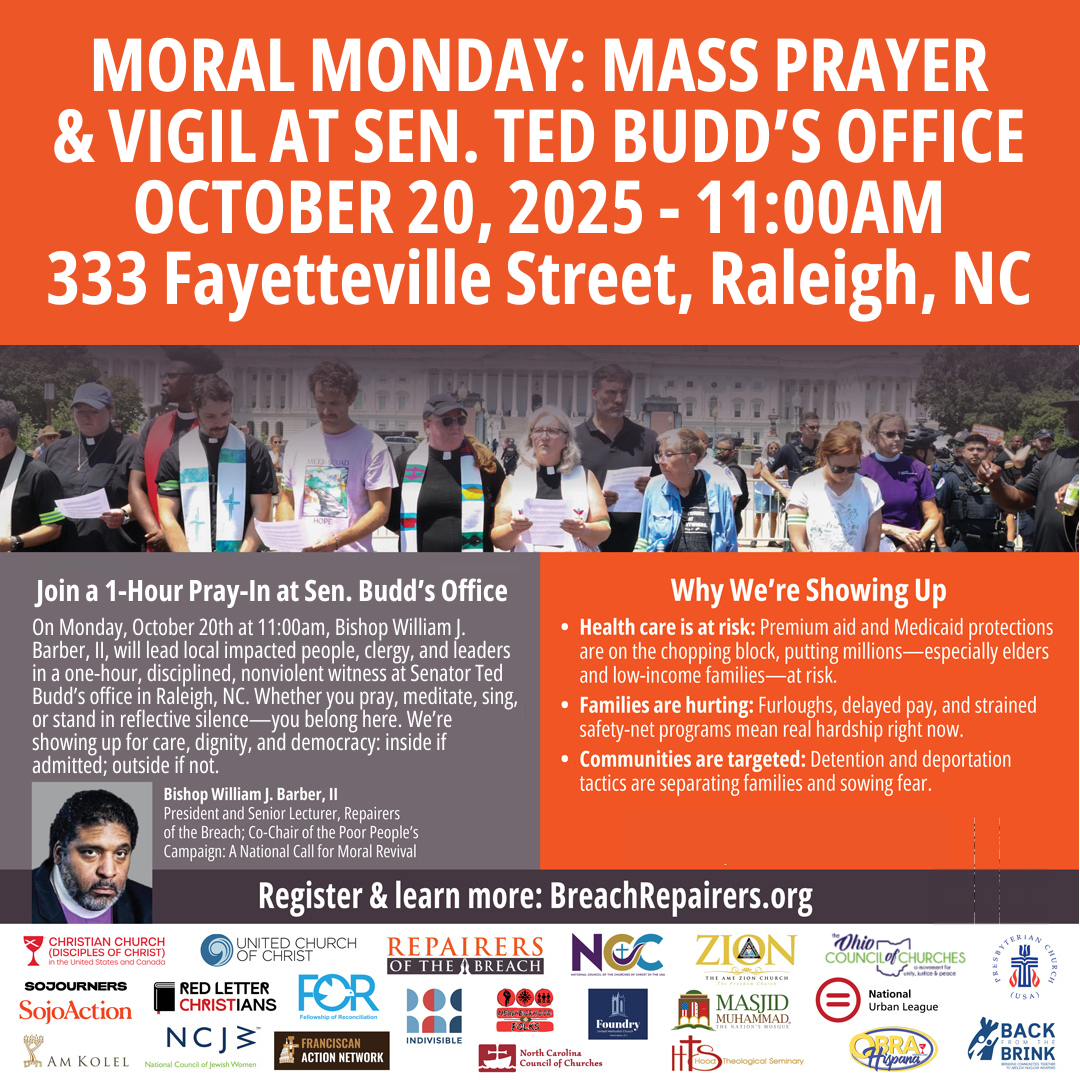 On Monday, October 20, poor people and low-wage workers, clergy, advocates, and others will join for Prayer and Vigils at the offices of Senators and Representatives across the U.S. – including Senator Ted Budd – to condemn Washington for codifying our nation’s largest-ever legislative transfer of wealth from the poor to the rich as well as opting to shut down the government rather than to discuss plans to extend tax credits for the ACA and the ongoing detention and deportation of immigrant communities.