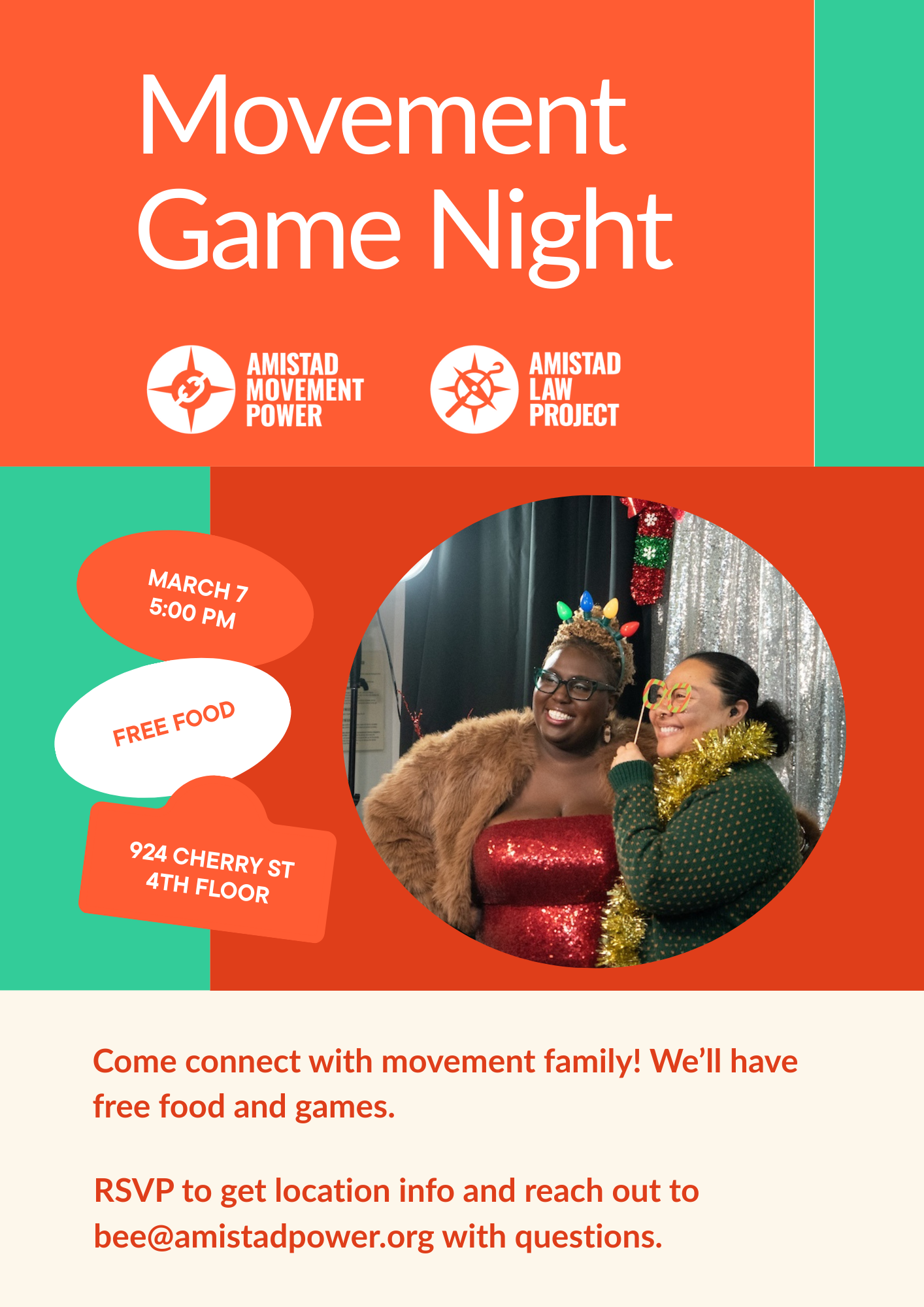 Come out to Amistad's Movement Game night to connect with other movement folks over some food and fun! We need these times of levity and connection to fuel the work for the long haul.