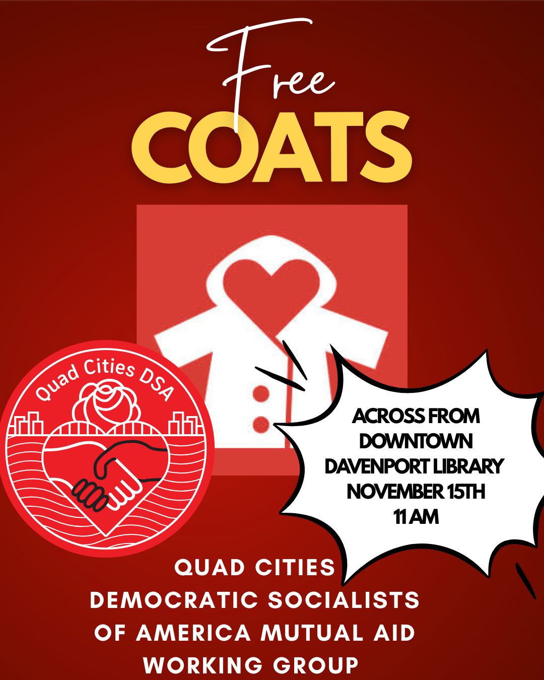 The Quad Cities DSA's Mutual Aid Working Group is committed to aiding and radicalizing our community, so fill out the form to let us know you'll be joining! We will be distributing items we have purchased and collected through donations to those in need.