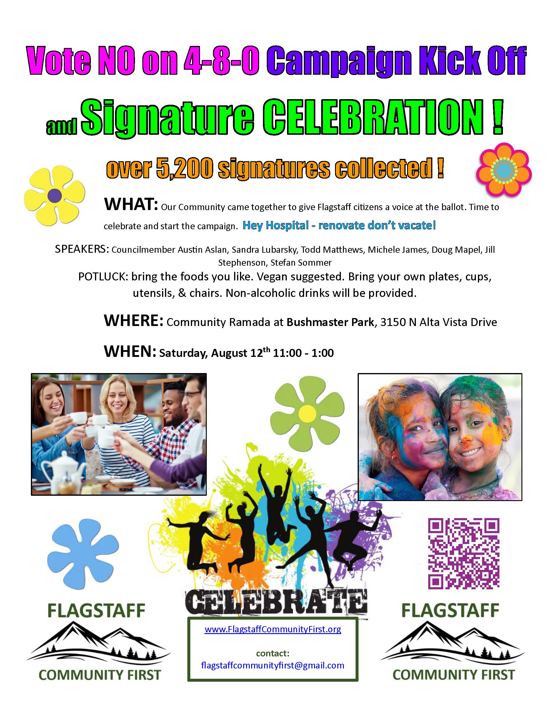 Join to celebrate and honor those who worked so hard for a significant unbelievable victory, gathering over 5600 signatures in 30 days to put NAH, the Northern Arizona Hospital, on the November Ballot for Flagstaff. We gather at Wheeler Park with numerous other groups and friends. Sign up on the right for a reminder. Then get ready to Say NO to 4 8 0!