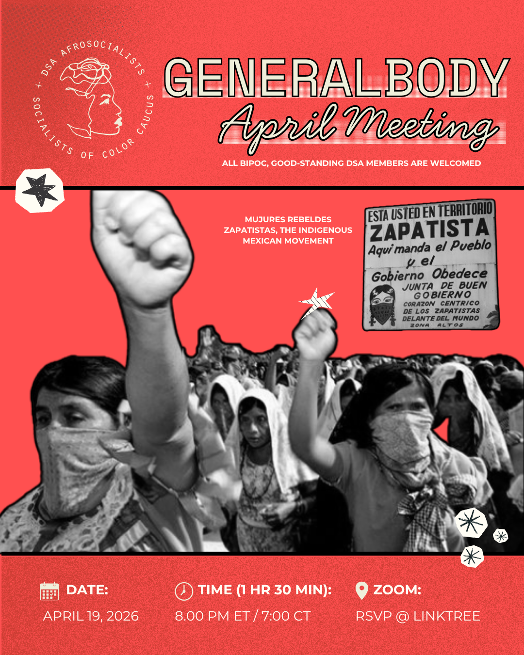 Comrades + Cousins: Join us for our April General Body Meeting! We will be discussion Commission updates, sharing national DSA opportunities for all DSA members, local AFROSOC events and much more. We also will be discussing our participation at the DSA Organizing Conference (July 31st-August 2nd) + Socialism Conference 2026 (September 2nd-4th) both taking place in Chicago, IL. Gotta question? Email us at afrosoc@dsacommittees.org.