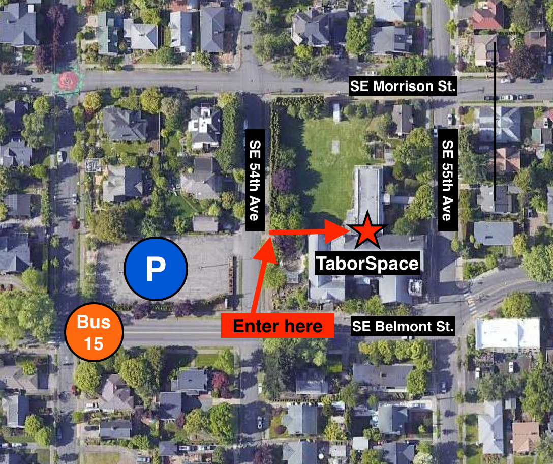 - TaborSpace is on Trimet Bus Route 15, which has multiple stops along Belmont near the venue. There is parking available in the lot at SE 54th & Belmont. The meeting entrance is directly across from the parking lot along SE 54th. There is a paved sloped walkway on 54th along the courtyard that leads down to where members will be checked in. Please use this accessible entrance!