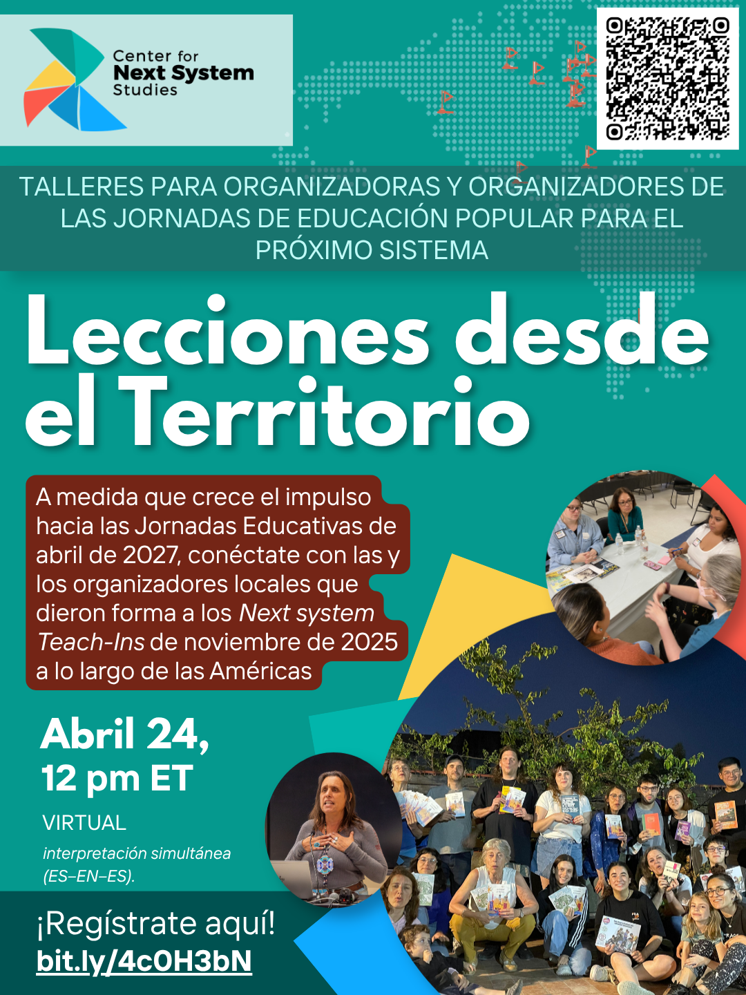 Acompáñanos en el primero de muchos Talleres para Organizadoras y Organizadores de las Jornadas de Educación Popular para el Próximo Sistema donde reflexionaremos sobre la ola de las Jornadas Educativas de 2025 y el trabajo que tenemos por delante. Analizaremos cómo nuestras y nuestros organizadores impulsaron el nacimiento del próximo sistema en sus territorios, compartiremos aprendizajes clave y consejos para nuevas personas organizadoras, también conversaremos sobre lo que emergió de este momento mientras trazamos nuestros planes colectivos hacia abril de 2027. Este será un espacio para destilar sabiduría, tejer puentes entre la acción local y la estrategia de largo plazo, y fortalecer la infraestructura para la próxima ola de organización.