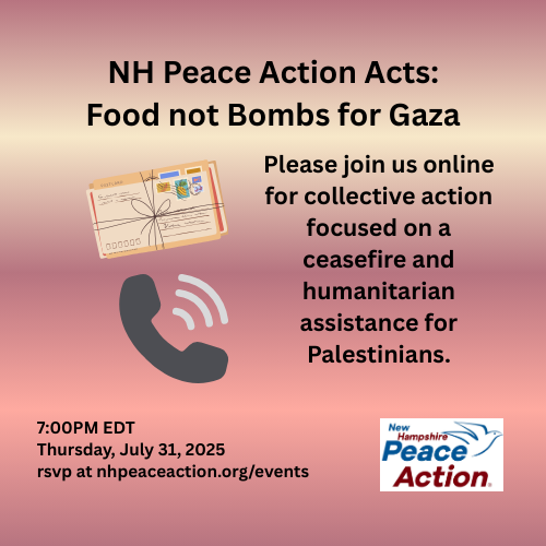 Please join NHPA and the Friends Committee on National Legislation NH Advocacy Team for collective action focused on replacing the deadly U.S. policy in Gaza with true humanitarian aid.