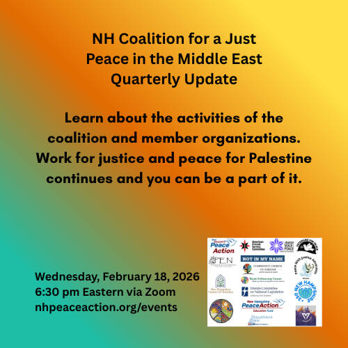 NH Coalition for a Just Peace in the Middle East will convene a quarterly online meeting Wednesday, February 18th, 6:30-8pm ET on Zoom for members of our supporting organizations to catch up with us. We invite you to come learn about our present initiatives, and to hear about what campaigns our organizations are involved in to promote building peace, justice and liberation for Palestine and the region at this critical time.