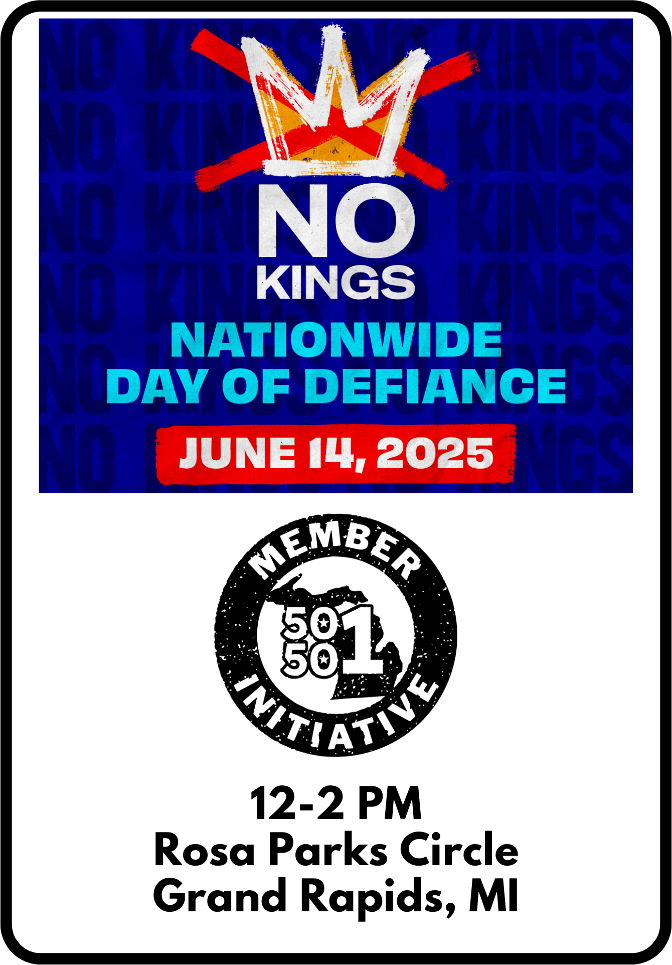 In collaboration with the ACLU, General Strike US, GRAARPR (Grand Rapids Alliance Against Racist and Political Repression), Palestine Solidarity GR, Movimiento Cosecha GR, GR Pride, Michigan Climate Action Network, Rank MI Vote, Grand Rapids Mutual Aid, MI Resist, Kent County Democratic Party, Protest for Progress, No Detention Center of MI, Moms Against Gun Violence, Urban Core Collective, Lindsay Richie Photography