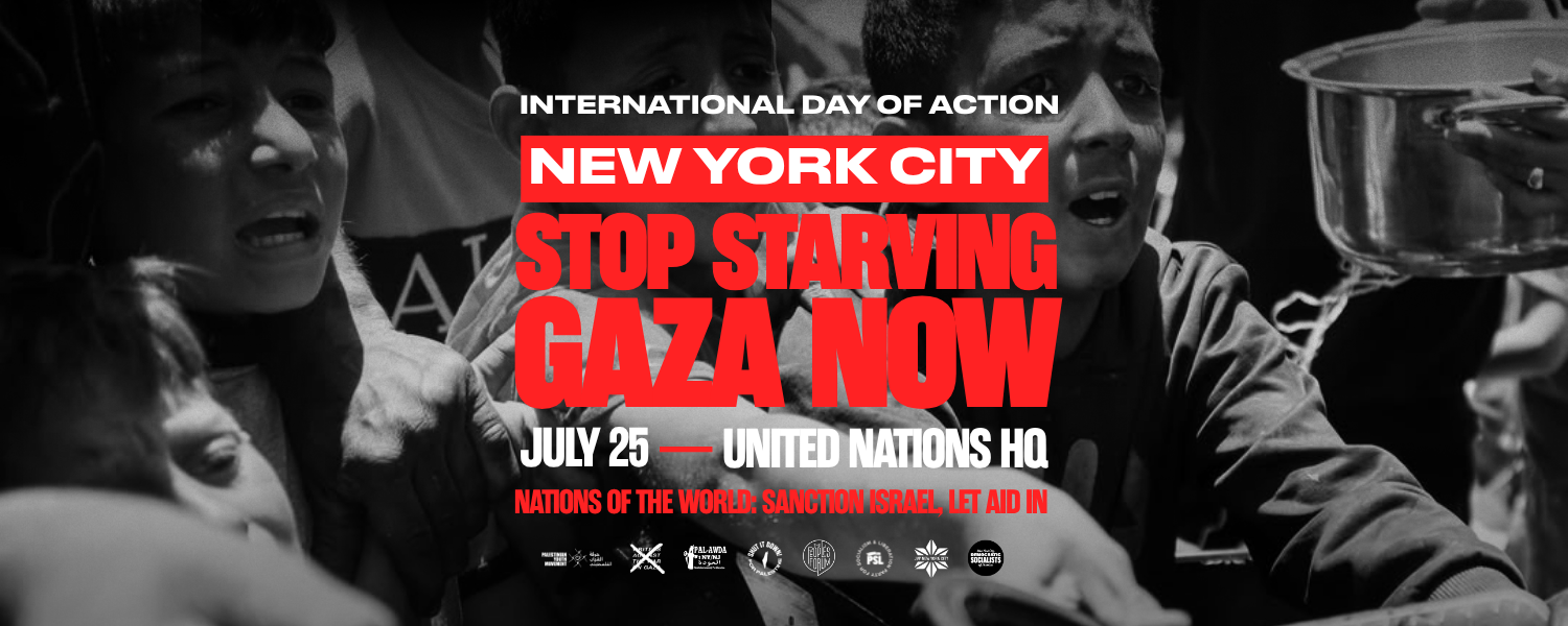 We will be in the streets alongside Palestinian Youth Movement, The People’s Forum, Jewish Voice for Peace, and people across the globe calling for an end to the US backed, Israeli manufactured famine in Gaza. Israel blockades lifesaving food and medicine, while IDF soldiers murder civilians seeking aid at US-run GHF distribution sites. Israel is starving Gaza, and the United States is complicit.
