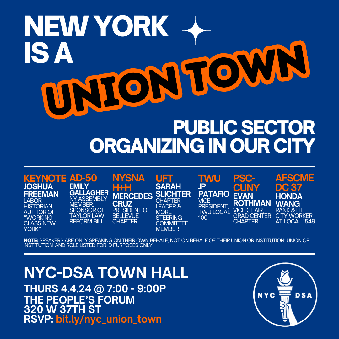 Over the past year, major public sector unions in NYC, including UFT (teachers), NYSNA (healthcare), DC 37 (city workers), and TWU (transit), either settled contracts, or in the case of PSC-CUNY (CUNY faculty & staff), are currently escalating an ongoing contract campaign. Join us to gain cross-industry insights from leaders involved in each of these struggles. We will delve into NYC's public sector unions, drawing lessons from experiences in previous contract campaigns, discussing ongoing or upcoming campaigns, analyzing the impact of the Taylor Law's prohibition on public sector right to strike, and assessing the connections between public sector union struggles and the well-being of our city.