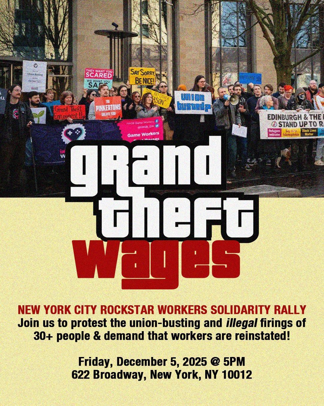 Join us as we rally with Tech Workers Coalition and other organizers across the industry outside Rockstar HQ to protest these illegal firings!