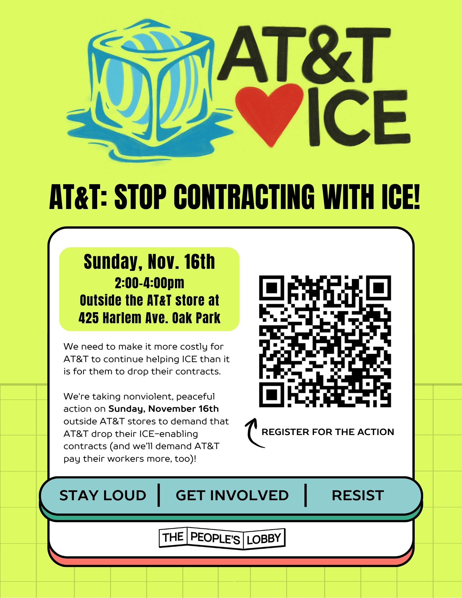 We're taking non-violent, peaceful action on Sunday, November 16th, outside the AT&T store to demand that AT&T drop its ICE-enabling contract (and we will also demand that AT&T pay its workers more).