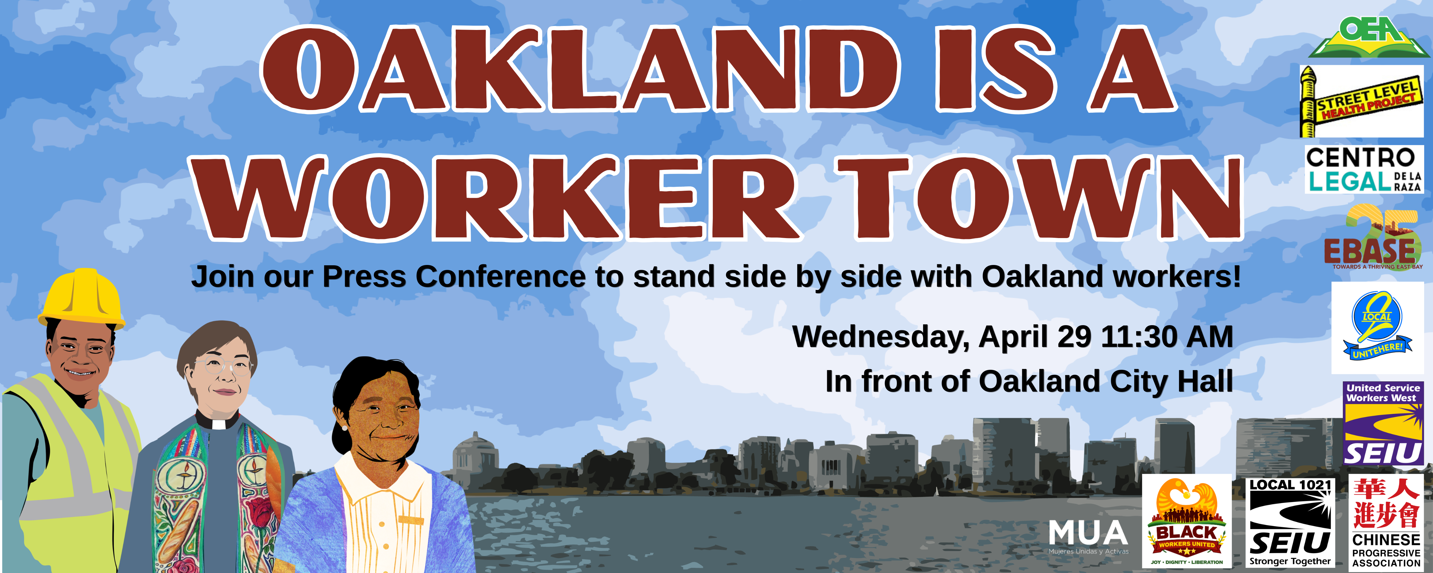 EBASE, Street Level Health Project, Centro Legal de La Raza, the Chinese Progressive Association, SEIU-USWW, UNITE HERE Local 2, the Oakland Education Association, SEIU 1021, Black Workers United, Mujeres Unidas y Activas, and other organizations protecting workers' rights are holding a press conference on Wednesday, April 29th at 11:30 am to celebrate that Oakland is a Worker Town. We are bringing together workers and worker rights organizations from across Oakland to honor the profound impact workers have made through their hard-work, organizing, courage, and solidarity. This event will be a part of a week of events, including Worker Memorial Day on April 28, and gear up to International Workers’ Day or May Day on May 1st— a day that has long centered the economic contributions and transformative movements of the working class. Join the “Oakland is a Worker Town” Press Conference to stand side by side with Oakland workers to show your love!