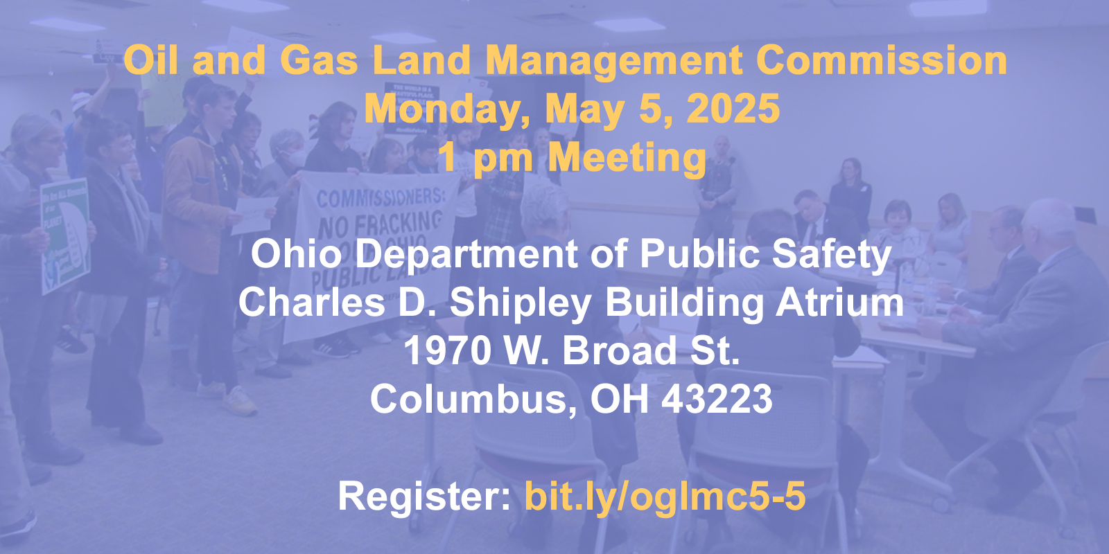 We have just received word that the Oil and Gas Land Management Commission will meet again on Monday, May 5, at 1 p.m. at the Ohio Department of Public Safety, Charles D. Shipley Building, 1970 W. Broad St., Columbus, OH 43223.