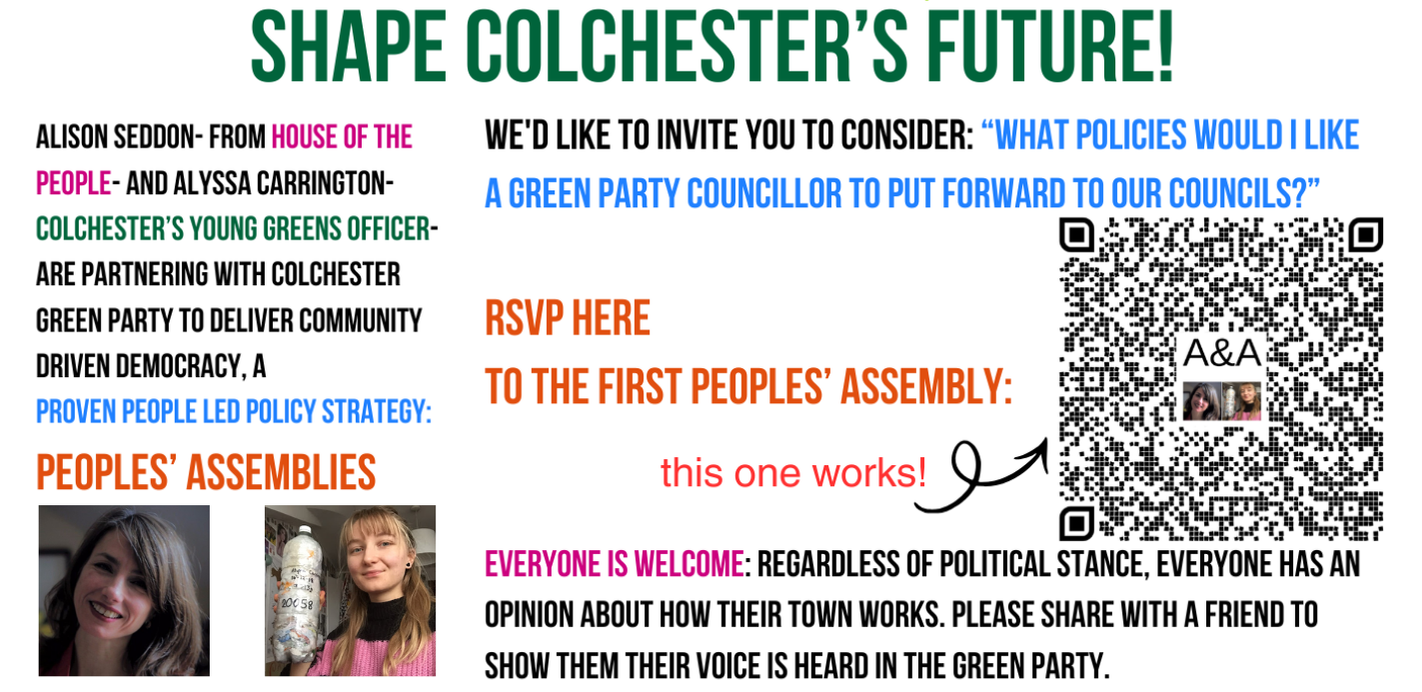 Alison Seddon is a qualified executive coach and facilitated at the House of the People in 2025. Alison is working with Alyssa, Colchester's Young Greens Officer, to deliver three peoples' assemblies leading up to the ECC election, in partnership with Colchester Green Party and our candidate, Amy Kirkby-Taylor.