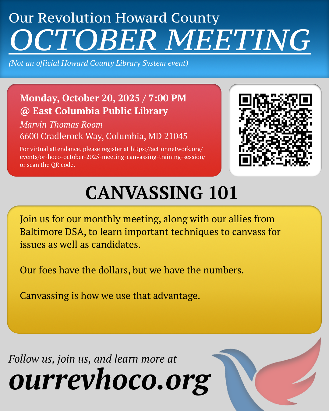 Join us on Monday, October 20, at 7:00pm for the monthly meeting of Our Revolution Howard County.