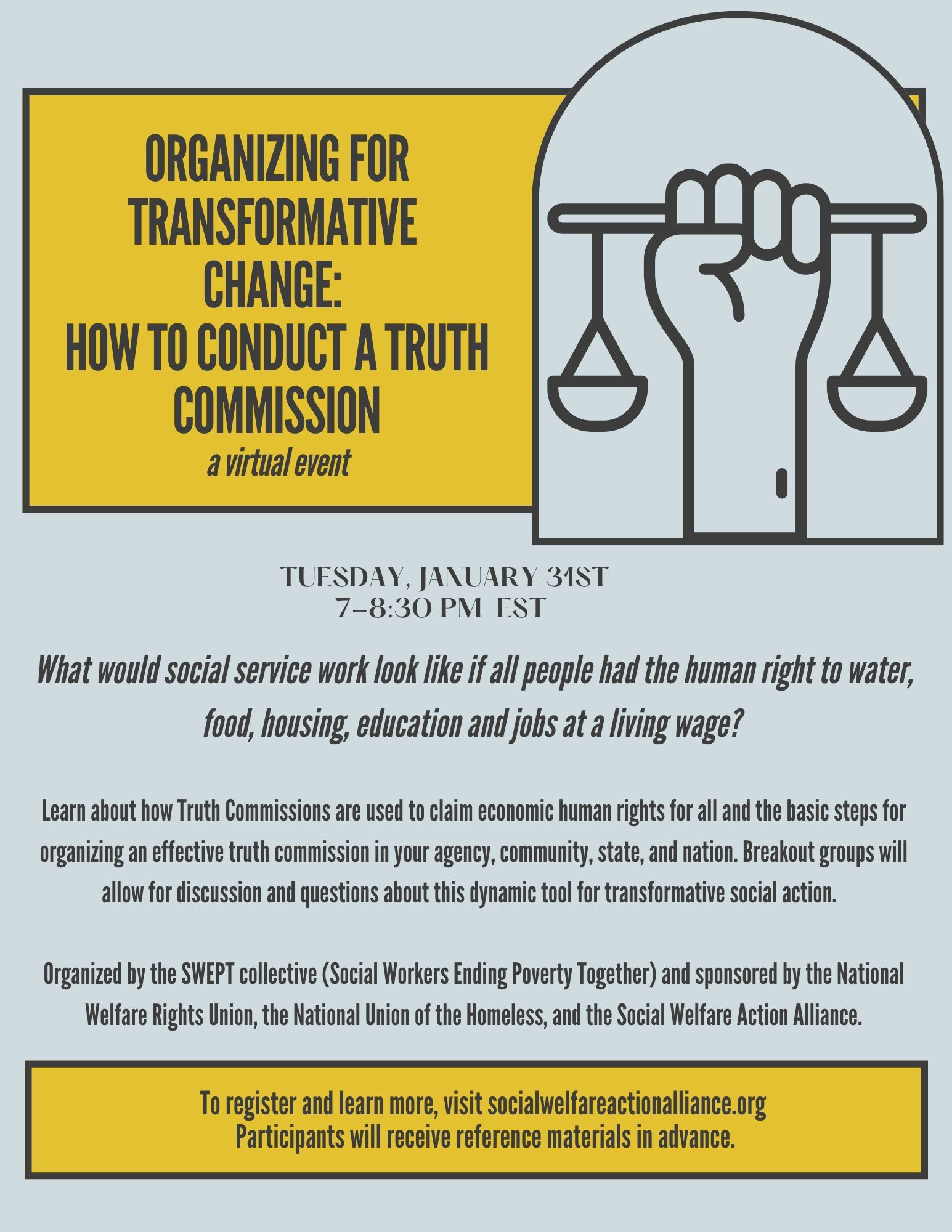 Learn about how Truth Commissions are used to claim economic human rights for all and the basic steps for organizing an effective truth commission in your agencies, communities, states and nation. Breakout groups will allow for discussion and questions about this dynamic tool for transformative social action.