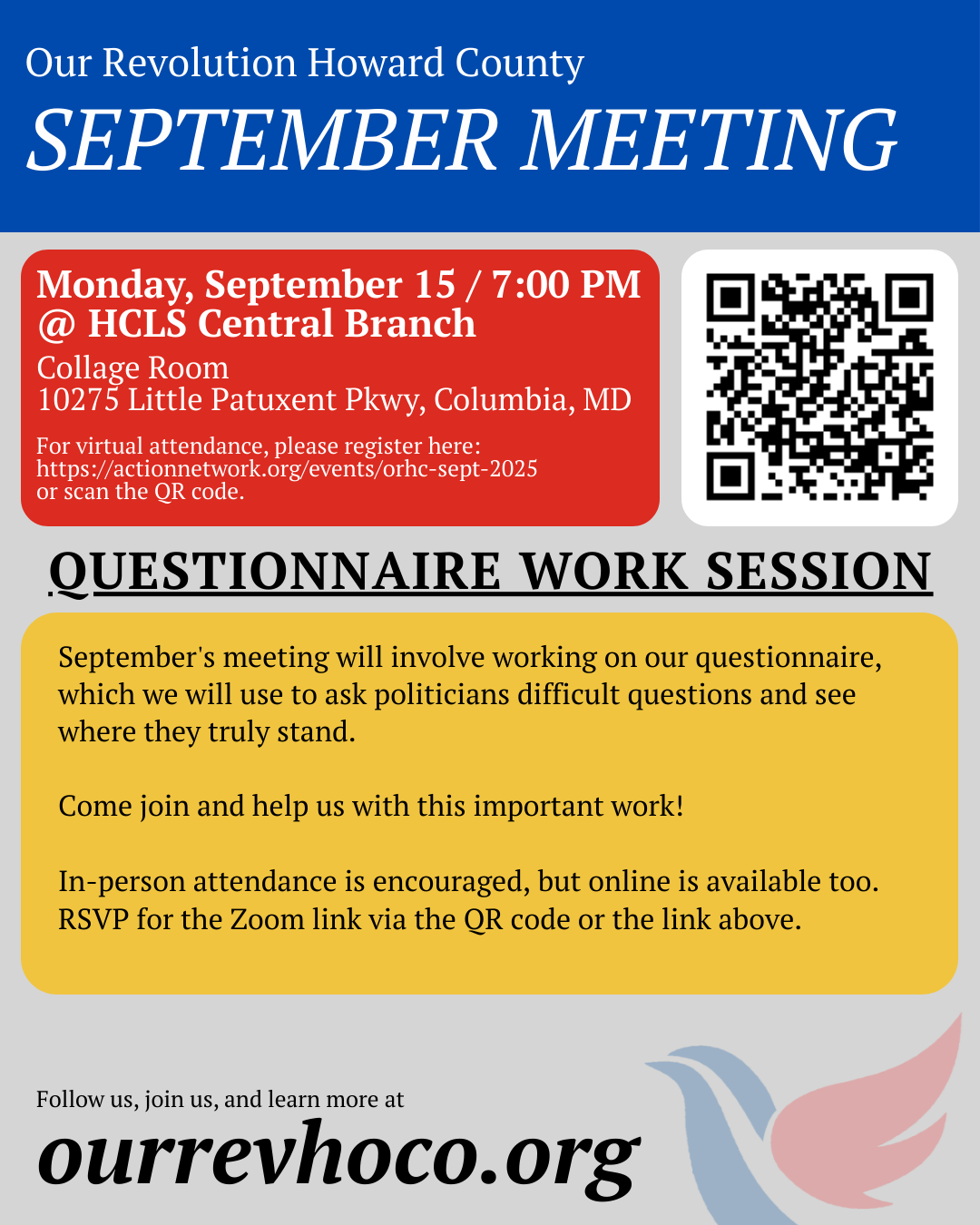 Join us on Monday, September 15, at 7:00pm for the monthly meeting of Our Revolution Howard County.
