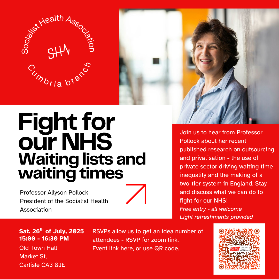 Professor Allyson Pollock joins Socialist Health Association Cumbria branch to discuss her recently published research and its findings on outsourcing and privatisation - the use of the private sector driving waiting time inequality, making of a two-tier system and costs to the NHS.