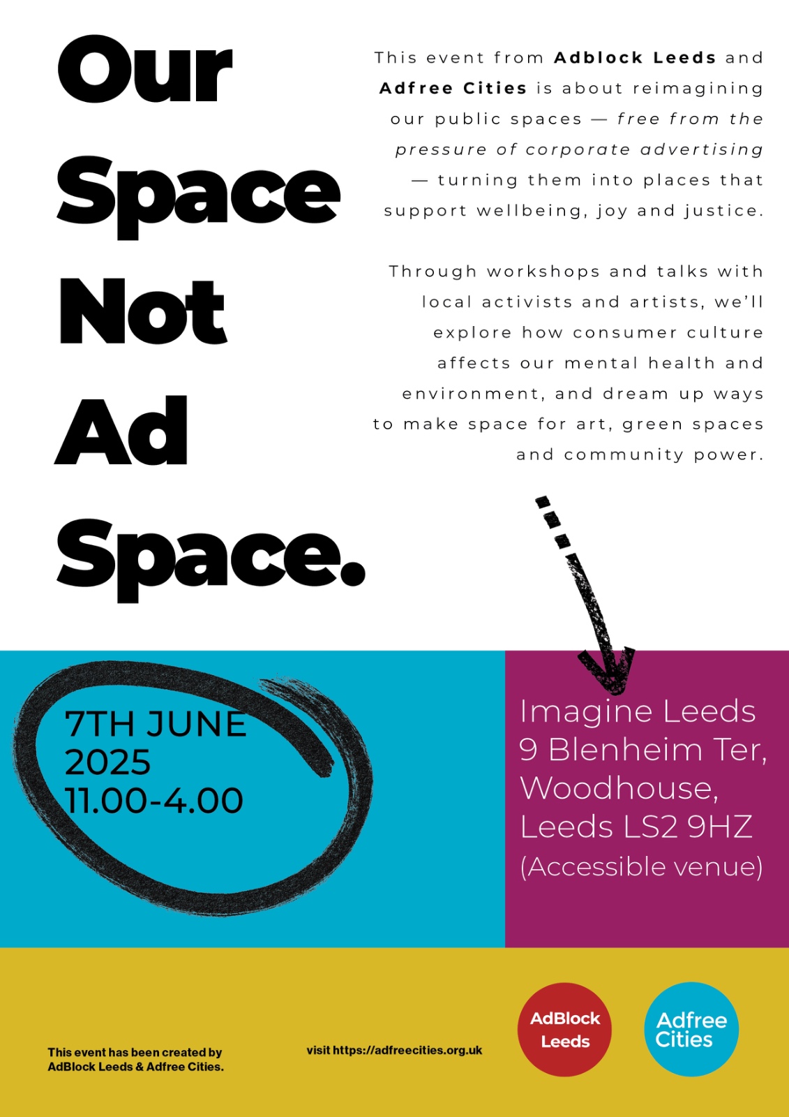 This event from AdBlock Leeds and Adfree Cities is about reimagining our public spaces—free from the pressure of corporate advertising— turning them into places that support wellbeing, joy and justice. We’ll hear from artists, activists, planners and local people who are working to make our cities fairer, greener and more caring.