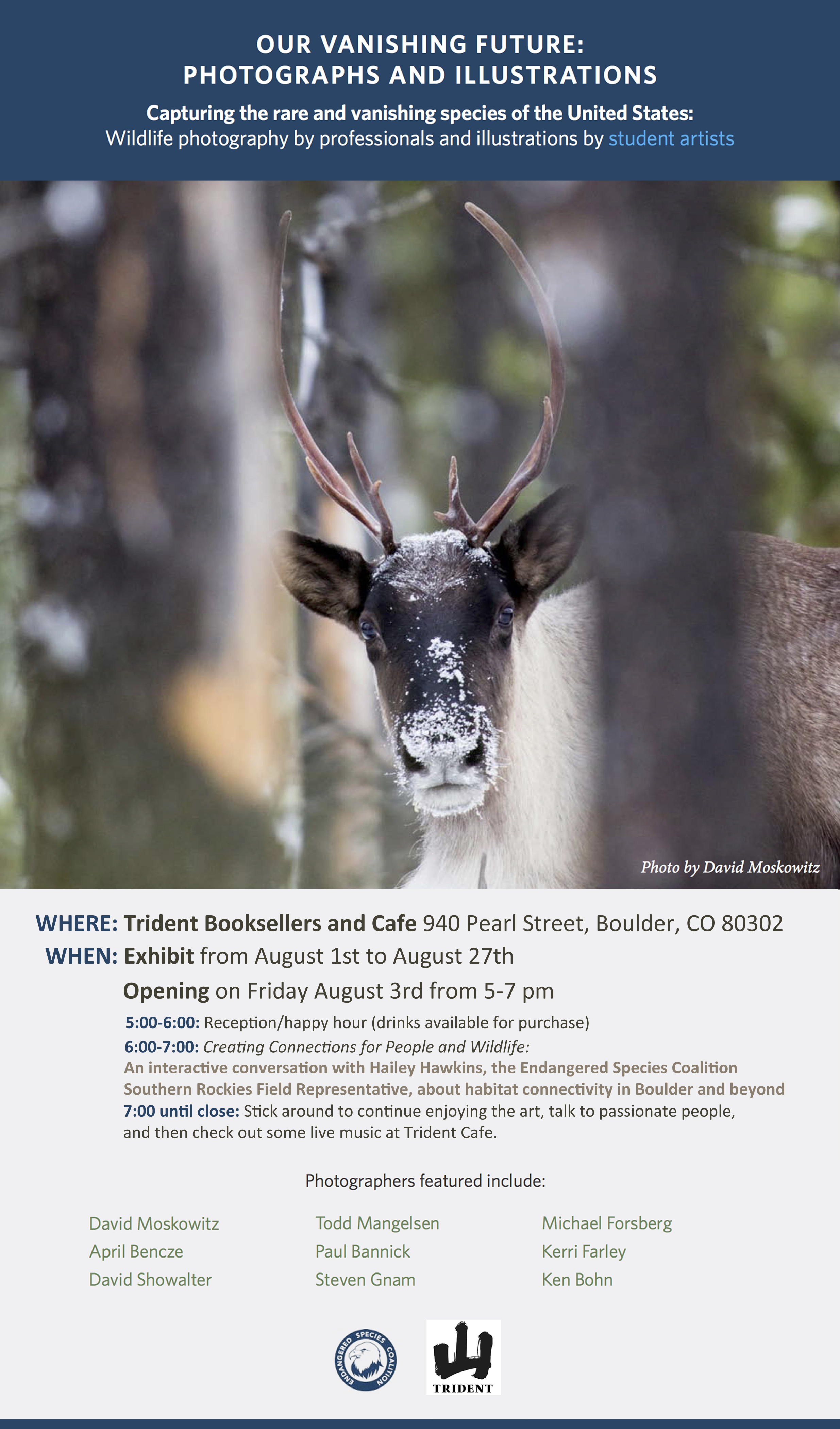 Join us at Trident Booksellers and Cafe on Friday, August 3rd from 5 - 7 PM for the opening of Our Vanishing Future: Photographs and Illustrations. This art exhibit will feature photographs by professionals and illustrations by student artists of our vanishing species. The art will be available to view from Wednesday, August 1st to Monday, August 27th at Trident Cafe.