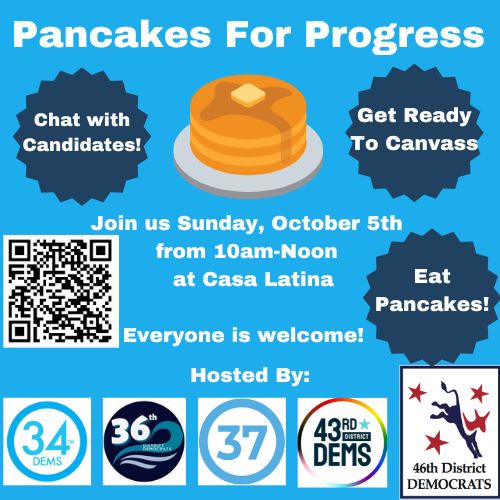 Join the 34th, 36th, 37th, 43rd and 46th LD Democrats for Pancakes for Progress! Grab some pancakes, chat with our endorsed candidates, pick up your materials for canvassing, and prepare to get out and talk to people in our community! Everyone is welcome.