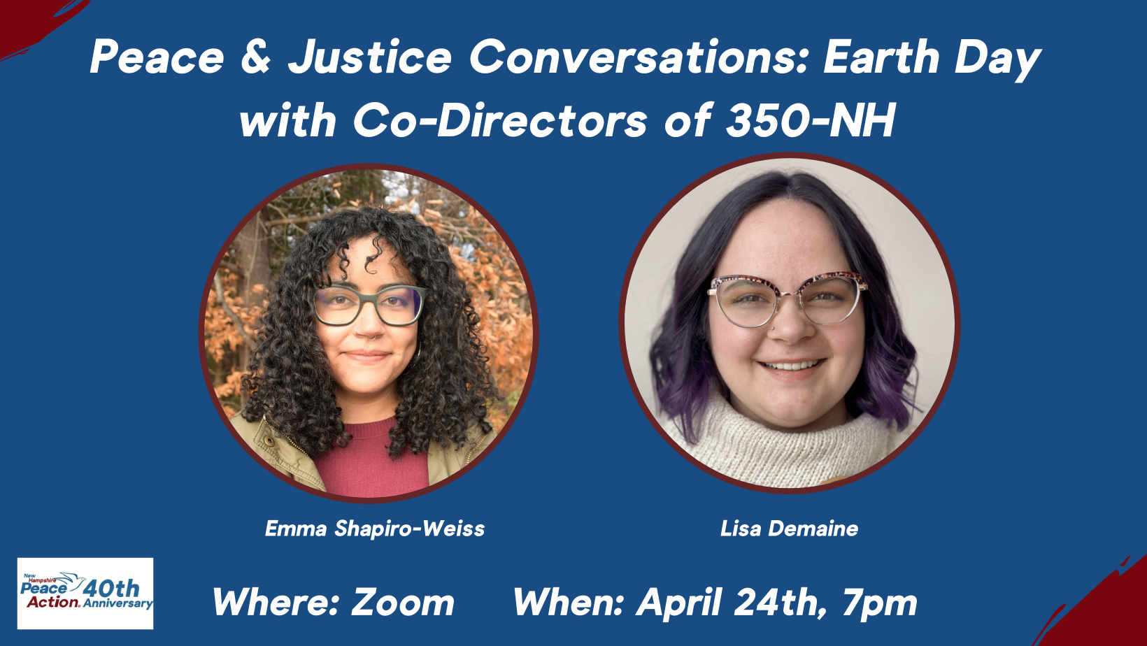 Join 350 NH Co-Directors Lisa & Emma for an Earth Day conversation on the existential threat climate change poses to humanity, how it connects to militarism, and how the peace and climate justice movements can work together to shape a just, safe, and sustainable future.