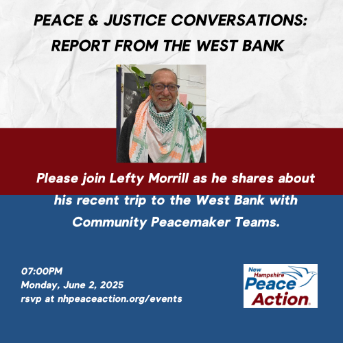 About NHPA’s bi-weekly Zoom Peace & Justice Conversation Series: 2020’s upheavals brought us to a new moment of reckoning and possibility. How do we want to live in the world? What do we value? How can we make the changes we’ve been yearning for? NH Peace Action has been engaged in working for change for decades. We’d like to bring you into these conversations about issues and options for the future. There is no charge to attend, but your contributions in any amount are greatly appreciated.