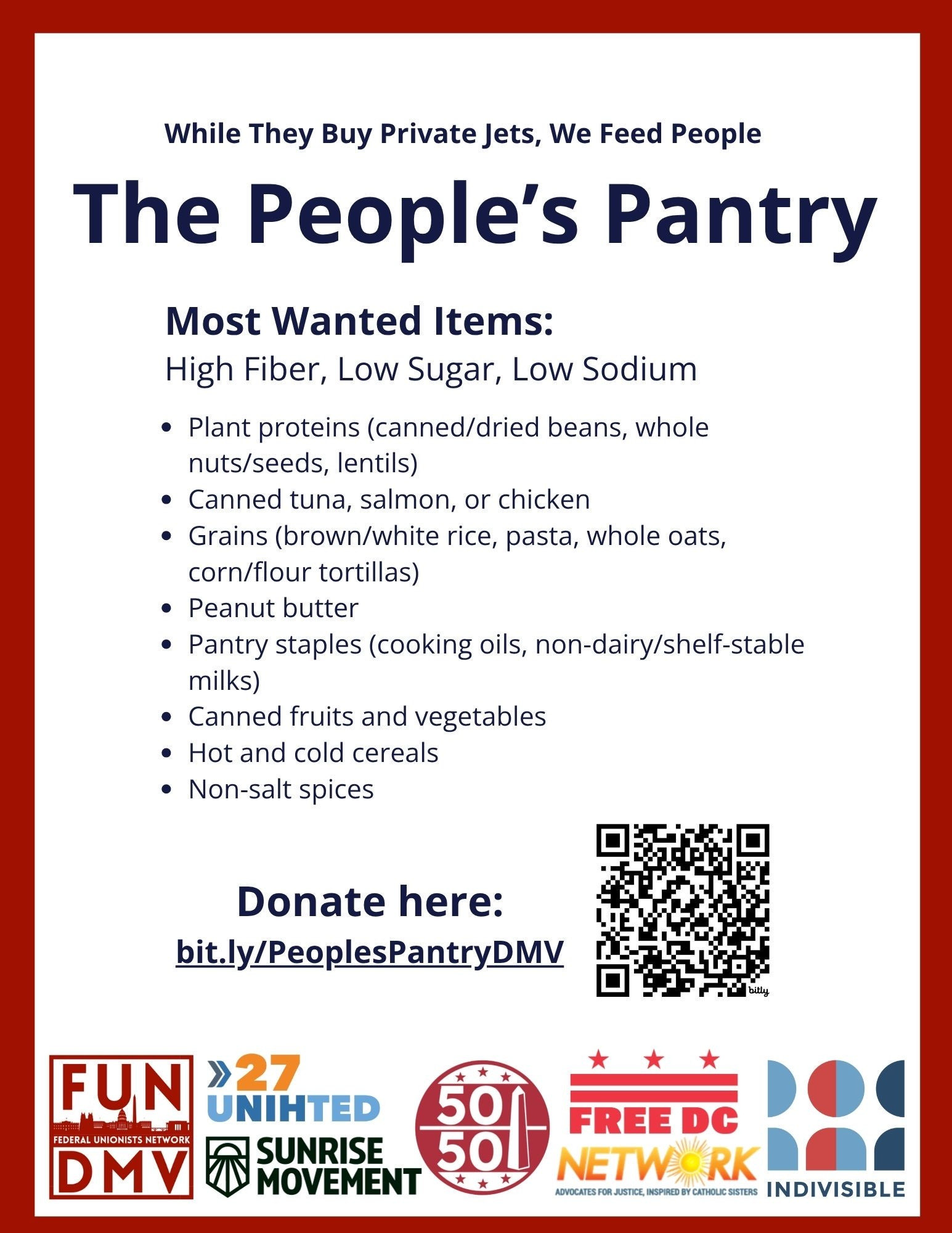 As the Trump Administration attempts to block emergency SNAP funds and dismantles public services, federal workers, faith leaders, unions, and allies are stepping up to make sure hungry Americans are fed by collecting food and donations. Join us on Thursday, bring nonperishable food donations, and help us spread the word.
