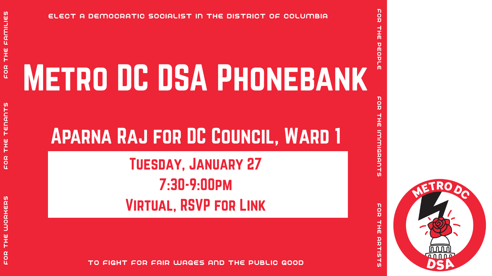 Phonebank with Metro DC DSA in support of our endorsed candidate in the Ward 1 DC Council race -- Aparna Raj! You'll call fellow chapter members, ask folks to donate to get Aparna elected, and tell them more about how to volunteer with the campaign. Join us at 7:30 for a brief training and then we'll call for roughly an hour before debriefing our conversations. RSVP and the link to join will be sent day of.