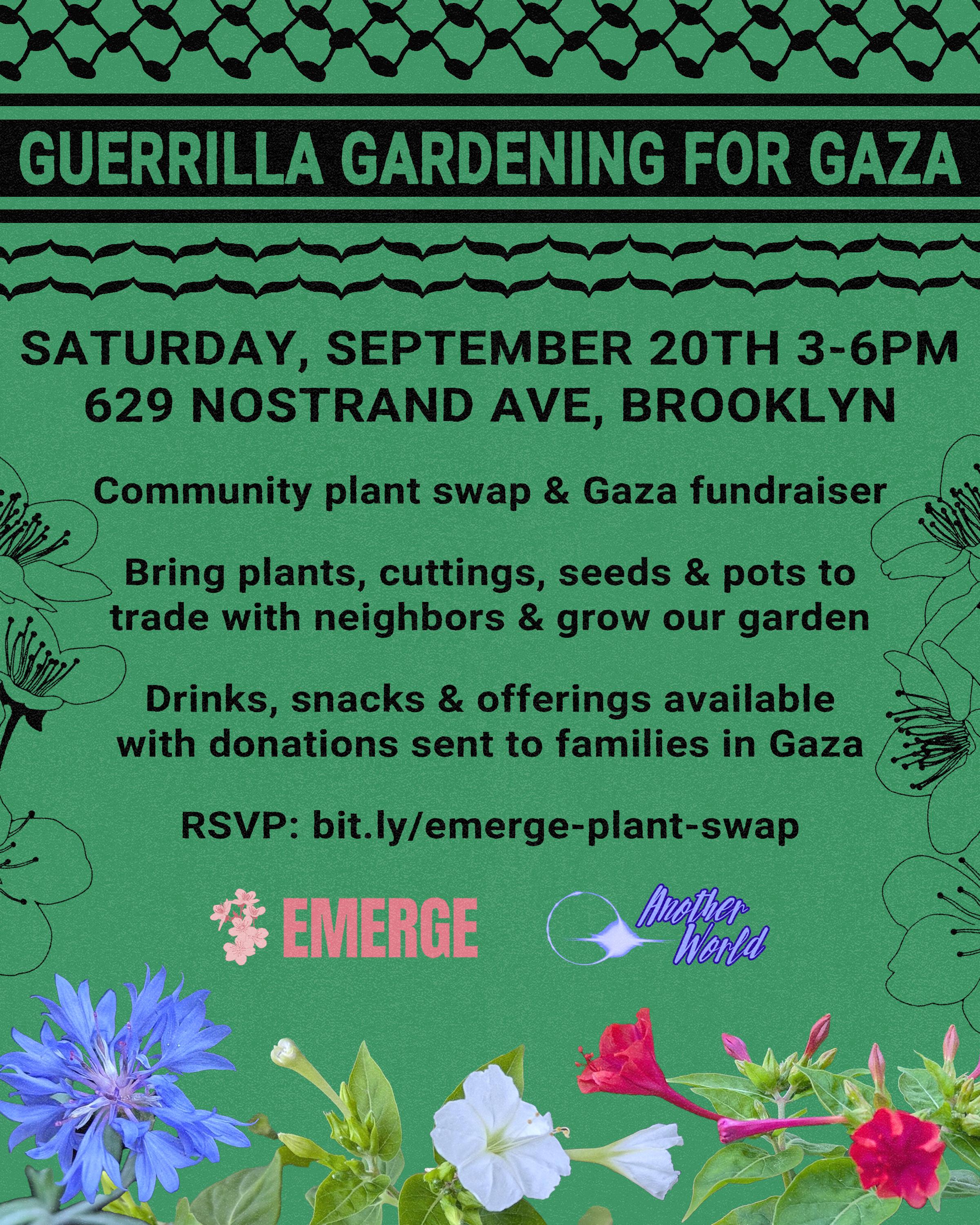 Guerilla Gardening for Gaza! Join us for a community plant swap event hosted with DSA Emerge to raise funds for Gaza. Bring plants, cuttings, seeds, or pots to swap or give! Help plant the garden at Another World! Snacks and drinks provided. All donations go to support families in Gaza.