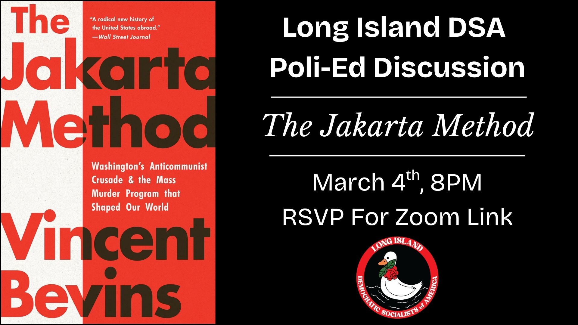 Join Long Island DSA's Political Education Working Group over Zoom on Wednesday, March 4th at 8pm as we discuss The Jakarta Method by Vincent Bevins!