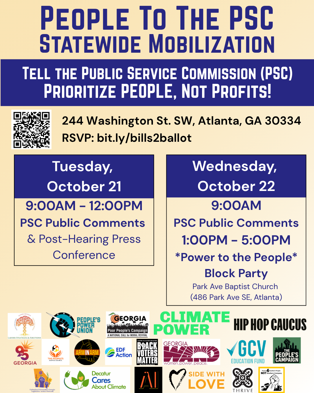 Join us for the Power to the People Mass Mobilization at the Georgia PSC's Hearings on Georgia Power's costly mass energy expansion. Help fight to lower our Georgia Power bills and win affordable clean energy across Georgia!