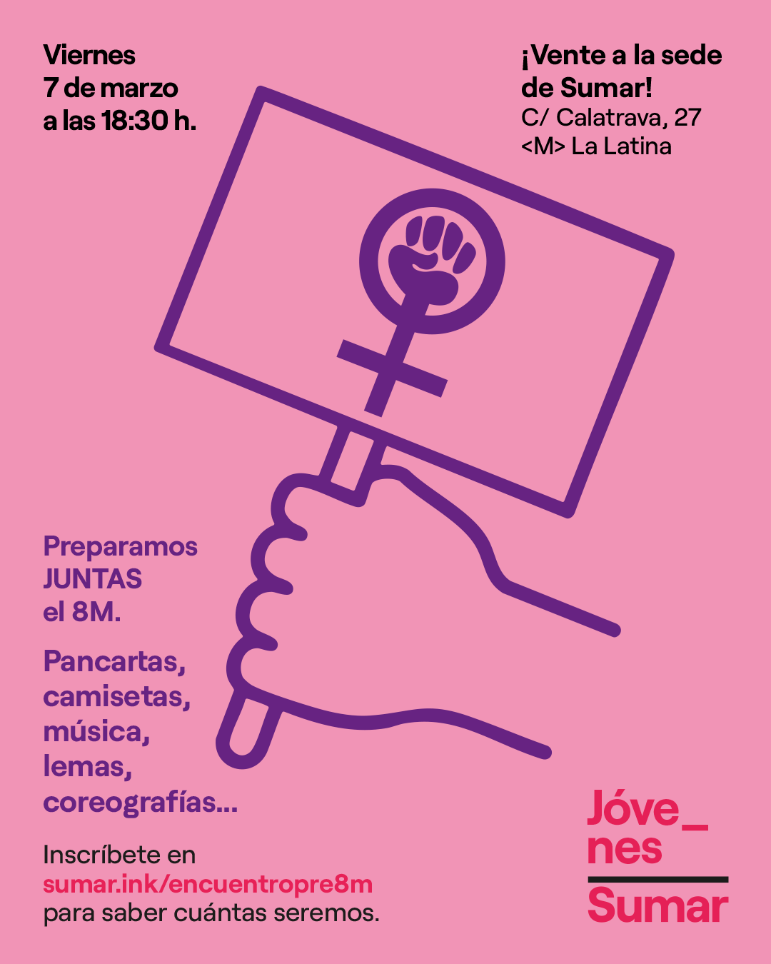 El viernes 7 de marzo a las 18:30 hemos quedado en la sede de Sumar para prepara juntas el 8M.