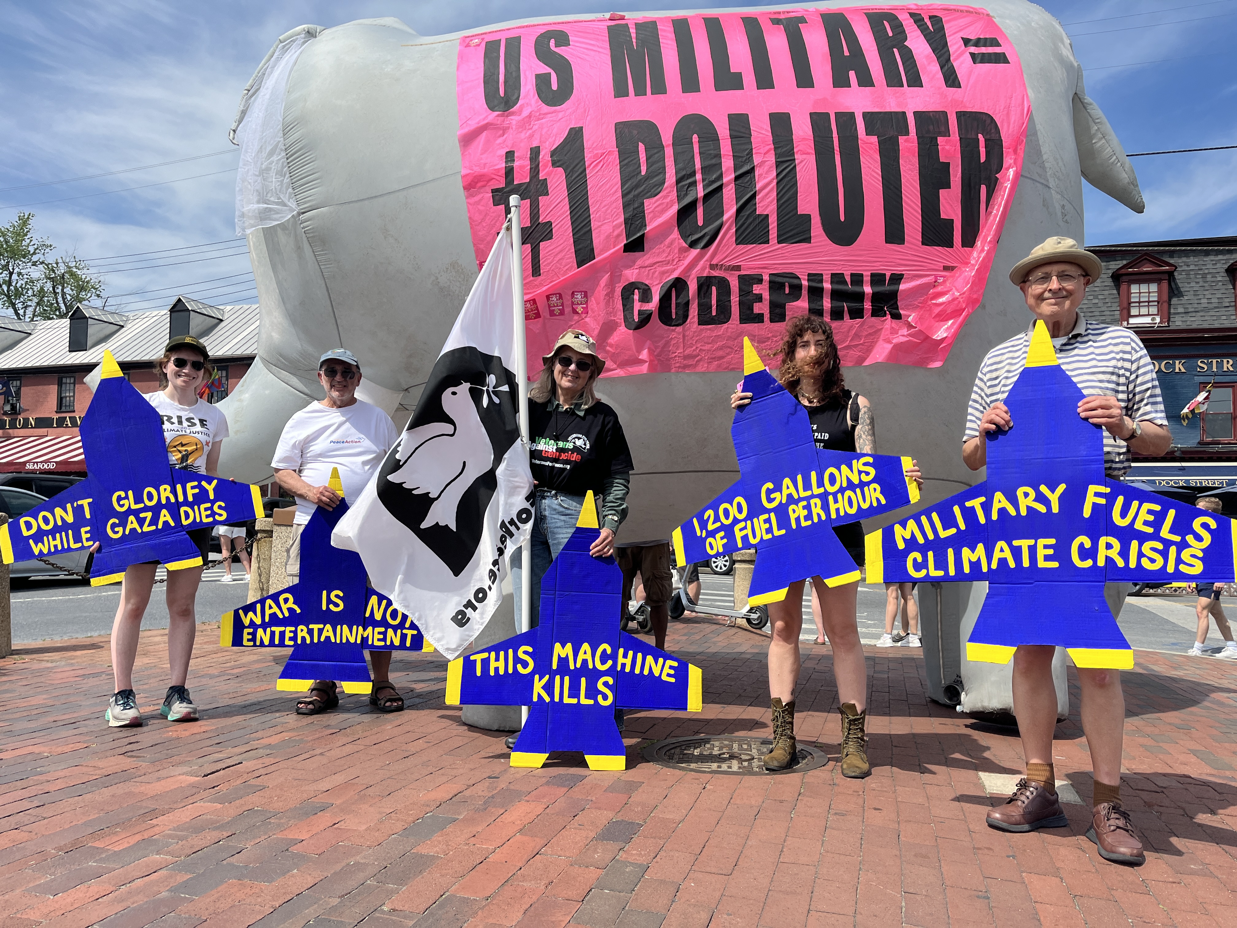 Join climate and peace activists to protest the Blue Angels in Annapolis on May 21st to expose the connection between militarism and the climate crisis. We'll gather around 12:30pm at City Dock near the Alex Haley statue to set up -- look for the big inflatable elephant. We will have signs and banners for you to hold and educational flyers for you to hand out to air show attendees and passersby to educate them about how air shows fuel the climate crisis. The air show is scheduled to begin at 2pm.