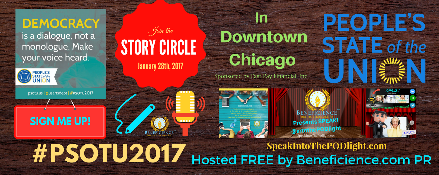 Hundreds to gather in Chicago to take part in this year's People's State of the Union Address Story Circle activity "Beneficience.com PR & SpeakIntoThePODlight PR radio show believe…"To change the world, we have to change our story!"
