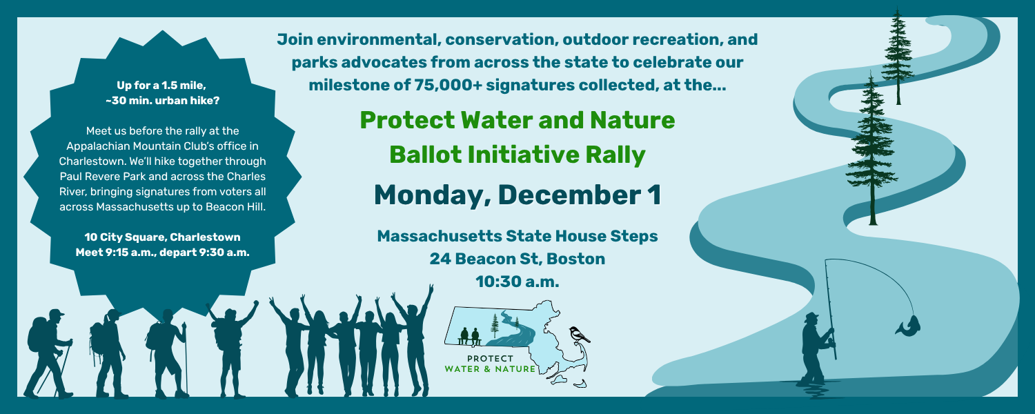 Are you ready to protect water and nature in Massachusetts? Join environmental, conservation, outdoor recreation, and parks advocates from across the state in Boston on Monday, December 1 for a celebratory rally as we turn in more than 75,000 signatures to qualify the Protect Water and Nature Ballot Initiative for the November 2026 ballot!