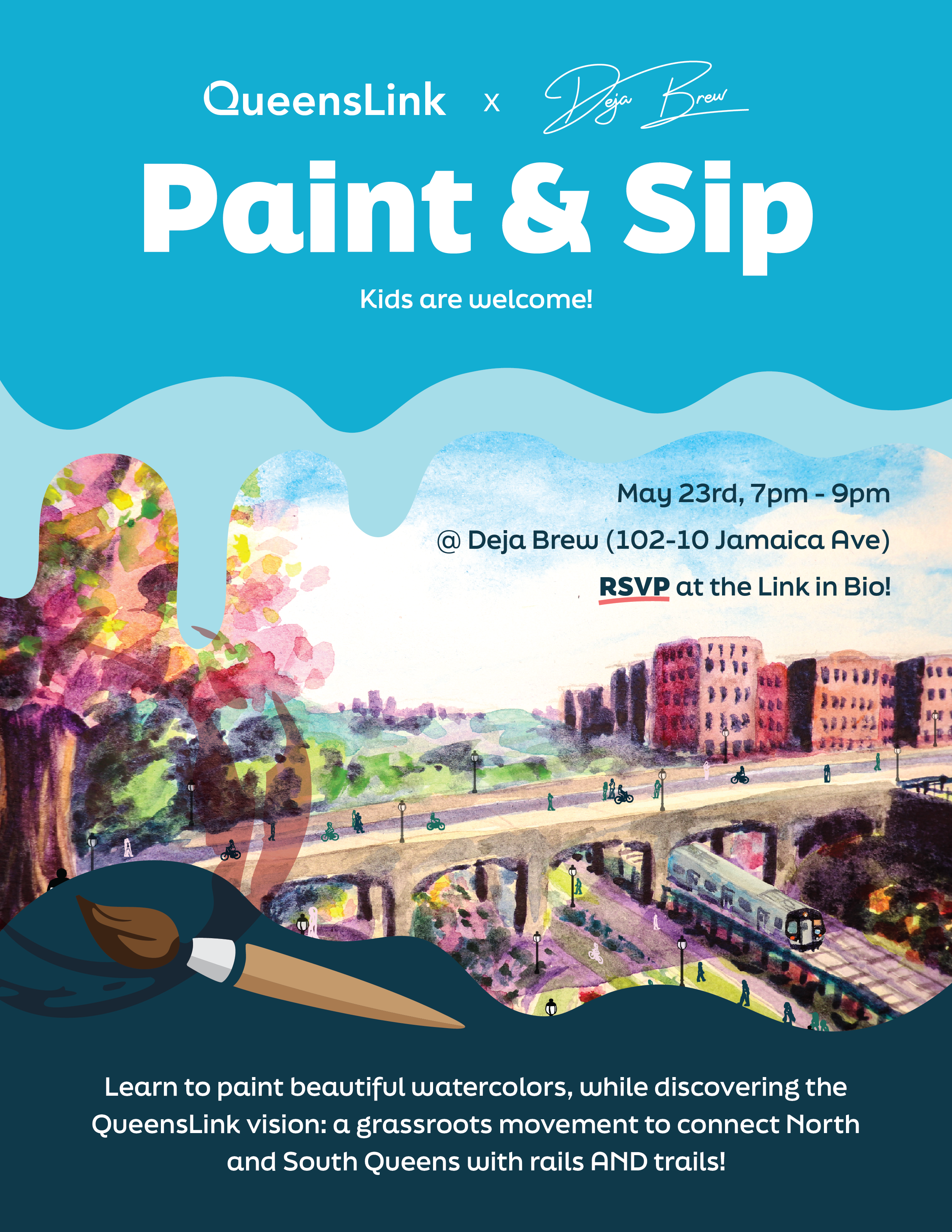 Learn to paint beautiful watercolors, while discovering the QueensLink vision: a grassroots movement to connect North and South Queens with rails AND trails! Admission and first drink is free, but additional drinks will be available for purchase separately!