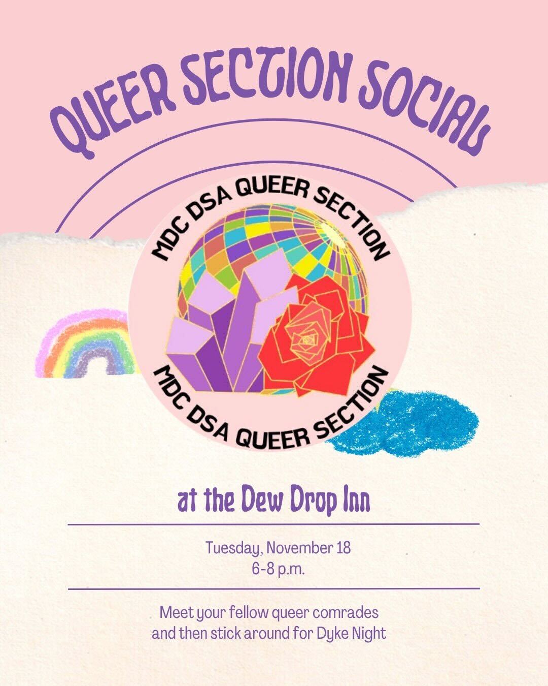 Join the MDC DSA Queer Section for our November Social ahead of Dyke Night at the Dew Drop Inn!