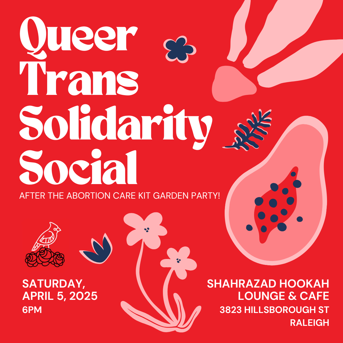 Looking for somewhere to eat after the Abortion Care Kit Garden Party? Drive about a few miles down the road to Shaharazad’s for the Queer and Trans Solidarity Social! Go to the food truck or next door to Al Baraka’s for dinner, have tea and knafeh, and smoke some hookah! It’ll be a laid back time. Open to queer folk and allies alike!