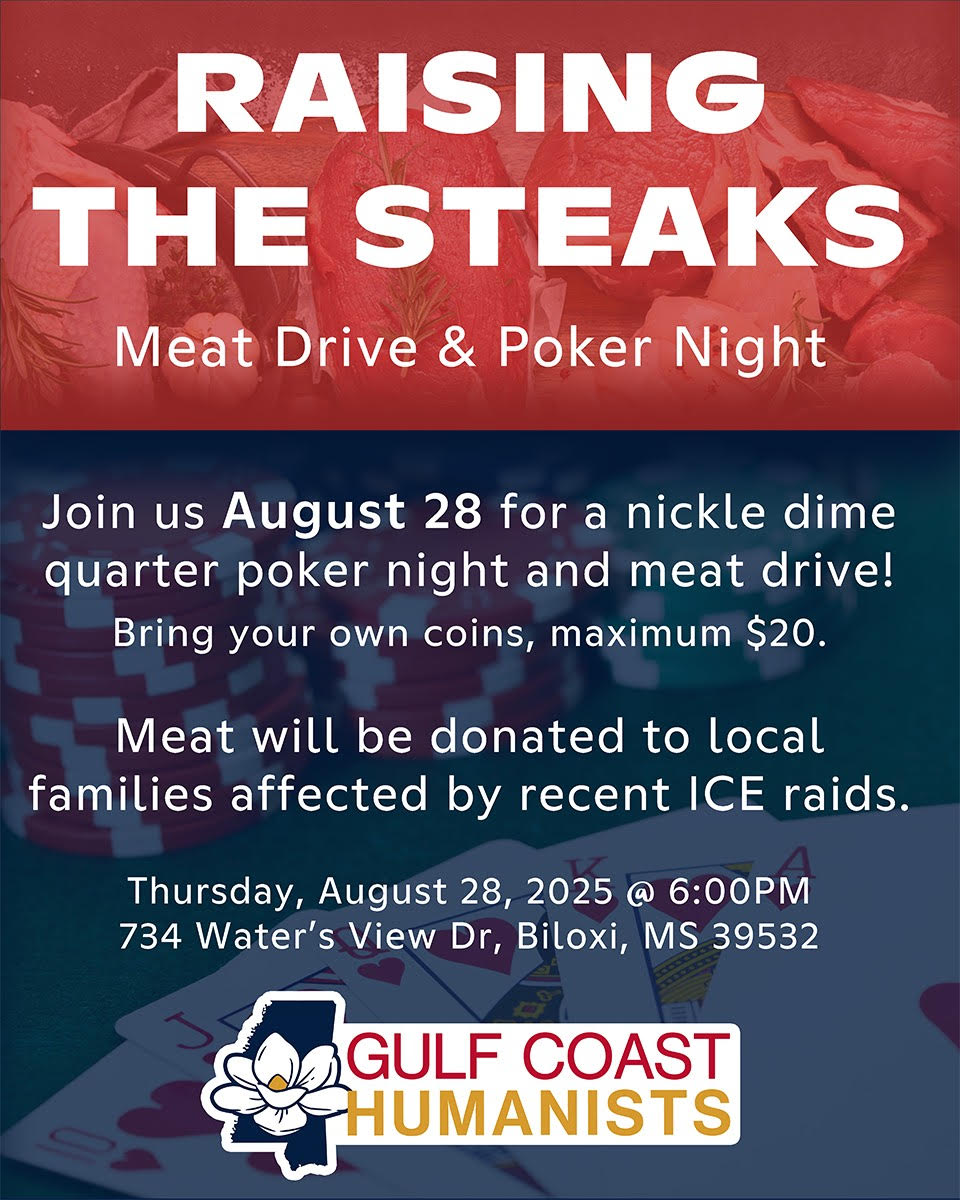 Come join us for our Gulf Coast Humanists’ August Social Event - High “Steaks” Poker Night - on Thursday, August 28th, at 6pm We’ll be playing some friendly hands of Nickel-Dime-Quarter-Poker, while also collecting proteins for the Immigrant Food Pantry. All donations will go toward feeding 19 Coast families affected by recent local ICE raids.